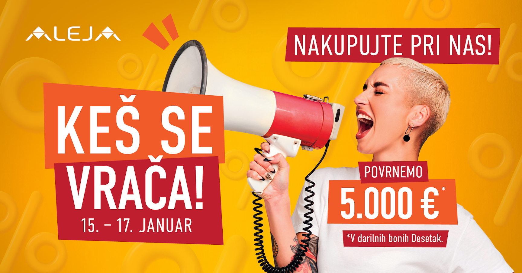 Popestrite si začetek leta z izjemno nakupovalno izkušnjo s številnimi odličnimi nagradami, zimskimi popusti in živahnim dogajanjem. Od tega četrtka do te sobote bo v nakupovalnih destinacijah ALEJA in Citypark potekala velika nagradna igra »Keš se vrača«. Podelili bodo kar 10.000 evrov v skupni vrednosti v darilnih bonih DESETAK. Poleg nagradne igre vas v trgovinah čakajo ekskluzivne ponudbe in ugodnosti.