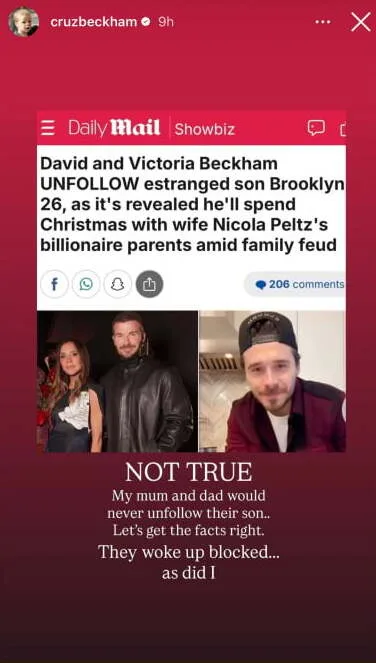 Cruz se je na Instagram zgodbah odzval na naslov članka časnika Daily Mail, ki je trdil, da sta David Beckham in Victoria Beckham prenehala slediti svojemu sinu Brooklynu na socialnih omrežjih.