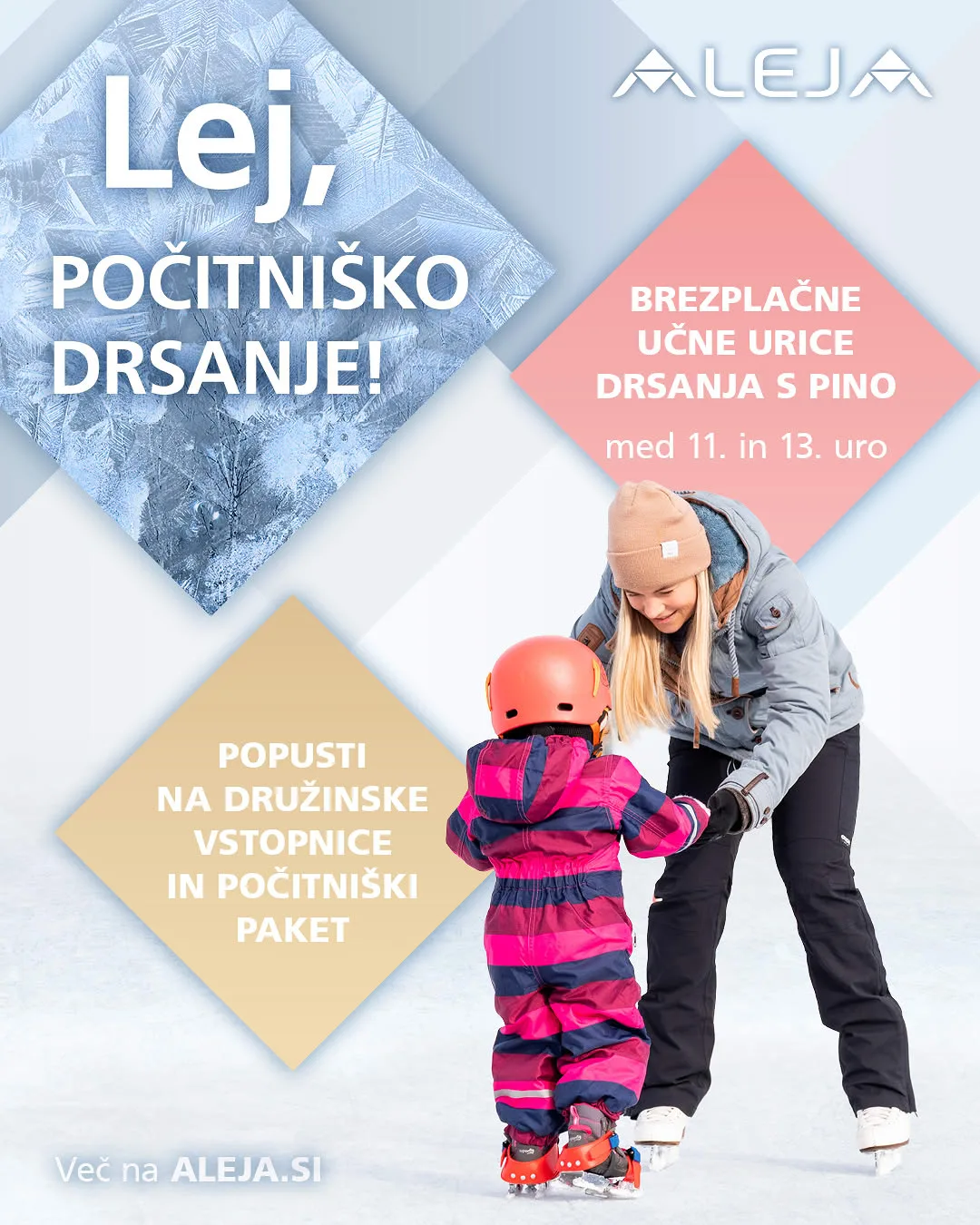 Vse do konca tedna pa lahko izkoristite počitniške ugodnosti za ALEJINO drsališče in doživite pravo zimsko dogodivščino na ledu. Pridružite se nam na zabavnih brezplačnih uricah drsanja s Pino, ki potekajo vsak dan do tega petka med 11. in 13. uro. Cela družina vabljena na rekreacijo in druženje na svežem zraku. Za najmlajše pa v ALEJI pripravljajo tudi priljubljene delavnice poslikave obraza, ki bodo od tega četrtka do te sobote med 17. in 19. uro.