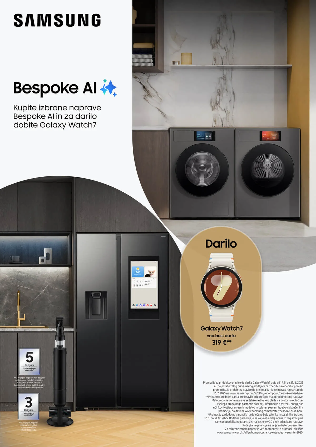 Od 19. maja do 29. junija 2025 je vsak, ki bo kupil izbrane naprave Samsung Bespoke AI, upravičen do darila – ure Galaxy Watch7, vredne 319 €.