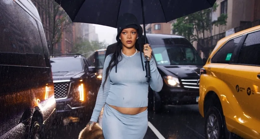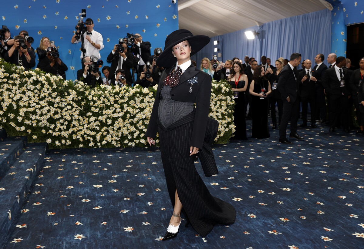Za 37-letno pop zvezdnico se je že nekaj časa ugibalo, ali je noseča s tretjim otrokom, zdaj pa je pred Met Galo 2025 razkrila, da pod srcem res nosi tretjega otroka. Rihanna je svoj nosečniški trebišček razkrila v svetlo modri oprijeti obleki v deževnem New Yorku.