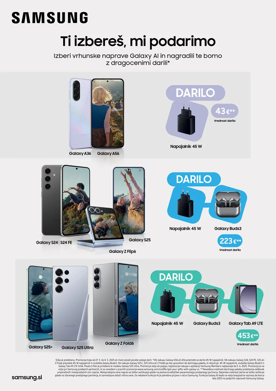 Samsung ti to pomlad ponuja Galaxy promocijo, ki poteka do 4. maja 2025 oziroma do razprodaje zalog, kjer bodo kupci modelov Galaxy A36 ali A56 bodo prejeli 45 W napajalnik. Tisti, ki se bodo odločili za Galaxy S24, S24 FE, Z Flip6 ali S25, bodo poleg 45 W napajalnika prejeli še brezžične slušalke Galaxy Buds3. Medtem bodo kupci modelov Galaxy S25+, S25 Ultra ali Z Fold6 prejeli 45 W napajalnik, slušalke Galaxy Buds3 in tablični računalnik Galaxy Tab A9 LTE. Izkoristi to enkratno priložnost in si pomladne dni polepšaj s Samsung napravami.