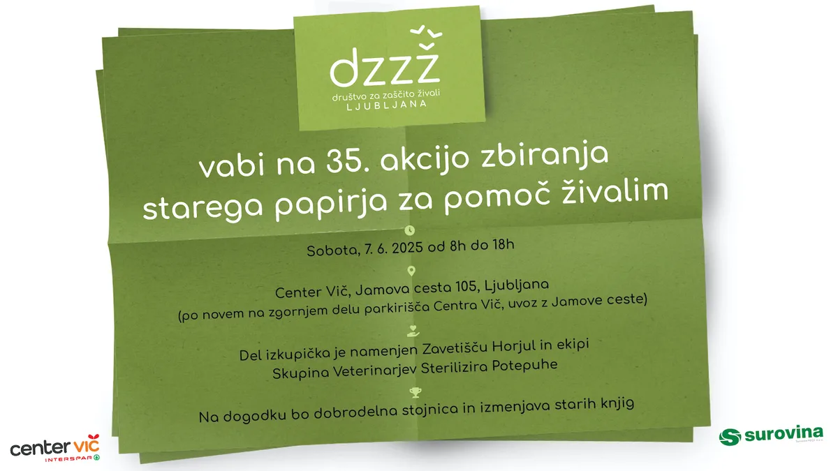 To soboto med 8. in 18. uro Center Vič vabi na 35. tradicionalno akcijo zbiranja starega papirja, knjig in drugega materiala. Akcija v organizaciji Društva za zaščito živali Ljubljana bo potekala na zgornjem delu parkirišča Centra Vič (Jamova cesta 105, Ljubljana, uvoz iz Jamove ceste). Dogodek se bo odvil v vsakem vremenu.